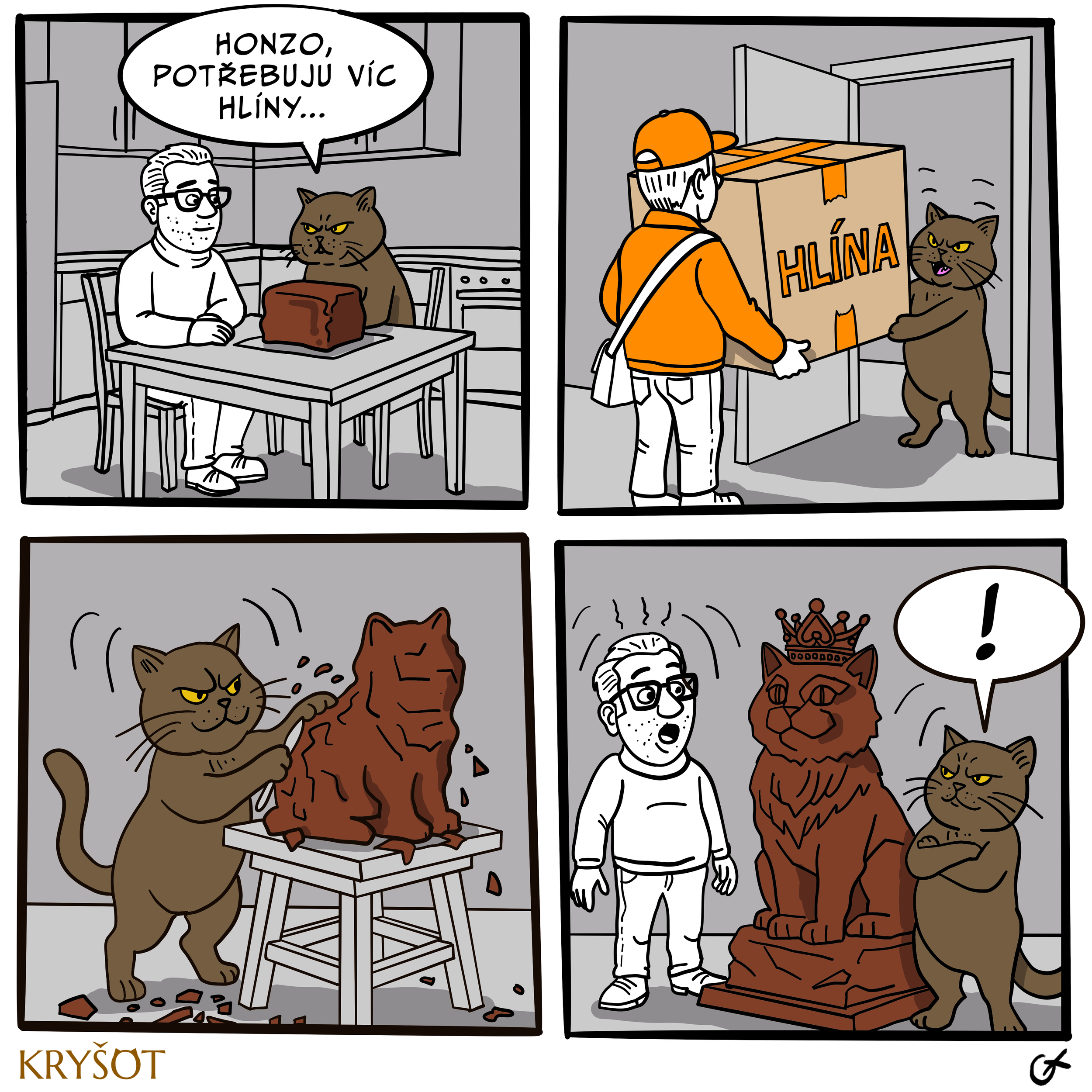 Toho dne si Kryšot vzpomněl, že si jako malé kotě rád hrál s hliněnou kuličkou. Když byl pak větší, rád chodil s Honzíkem do umělecké školy. No a teď, když má nad svým pánem jasnou kontrolu, měl by toho využít, nechat si nakoupit hlínu a stát se sochařem. Nojo, ale o čem bude jeho první skulptura?…